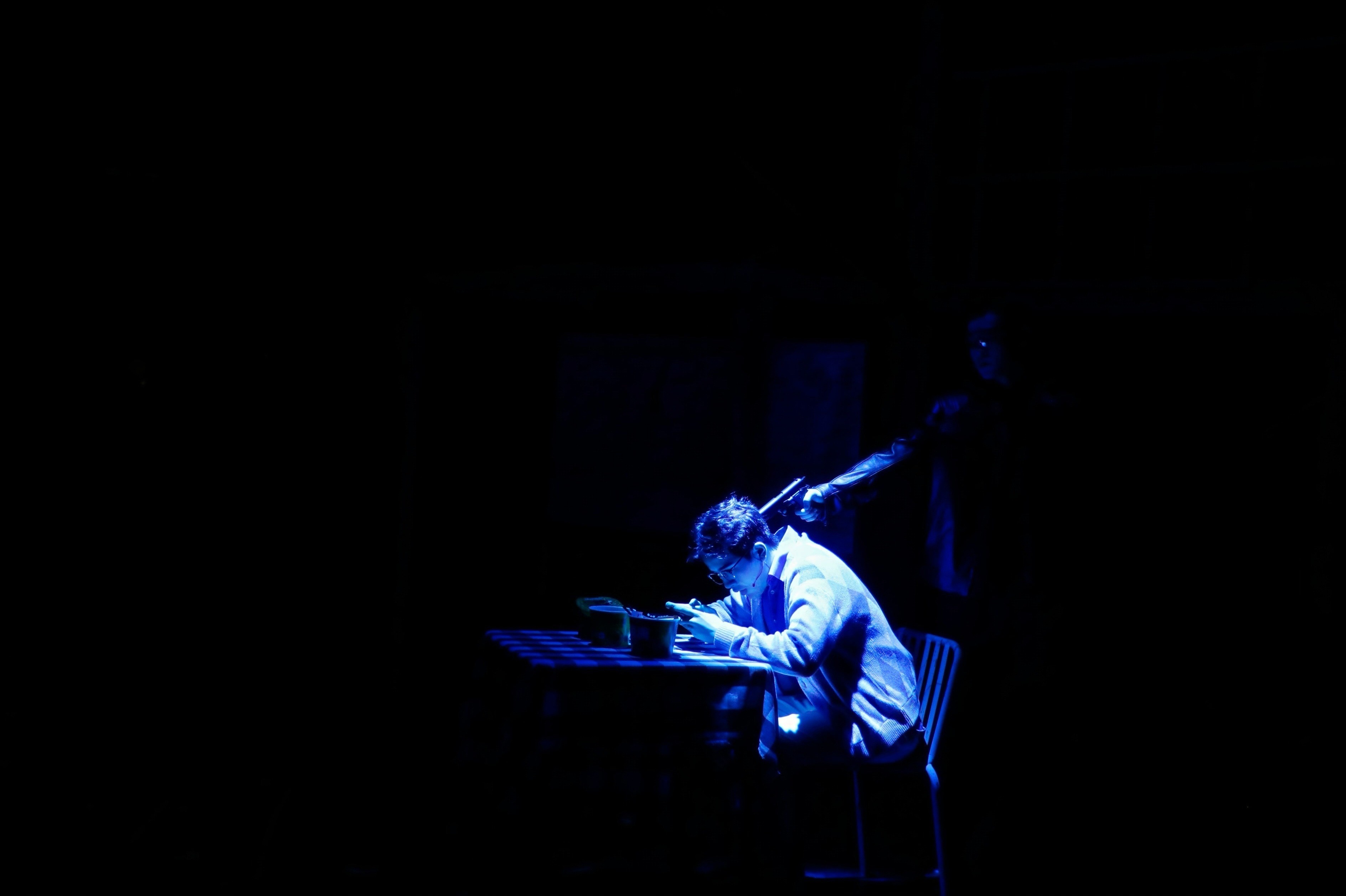 在大视听产业背景下,这场将戏剧表演与影像技术、多媒体交互深度绑定的创作,从创排的起始就注定要直面诸多前所未有的挑战,在初排阶段,导演秦修伦面临着将网络小说《杀手的礼物》从文字形象转化为舞台形象的复杂挑战。他表示,改编的核心在于寻找舞台的必然性:“我们需要在保留原著内核的基础上,进行大胆的提纯与重构。为了追求沉浸感,我们首次尝试了‘工’字形舞台与两侧观众席的布局,这直接改变了观演关系与叙事逻辑。”剧本为此历经十五稿打磨,旨在将原著相对独立的单元故事,编织成更具整体戏剧张力的舞台脉络,并融入对当下社会的观察。