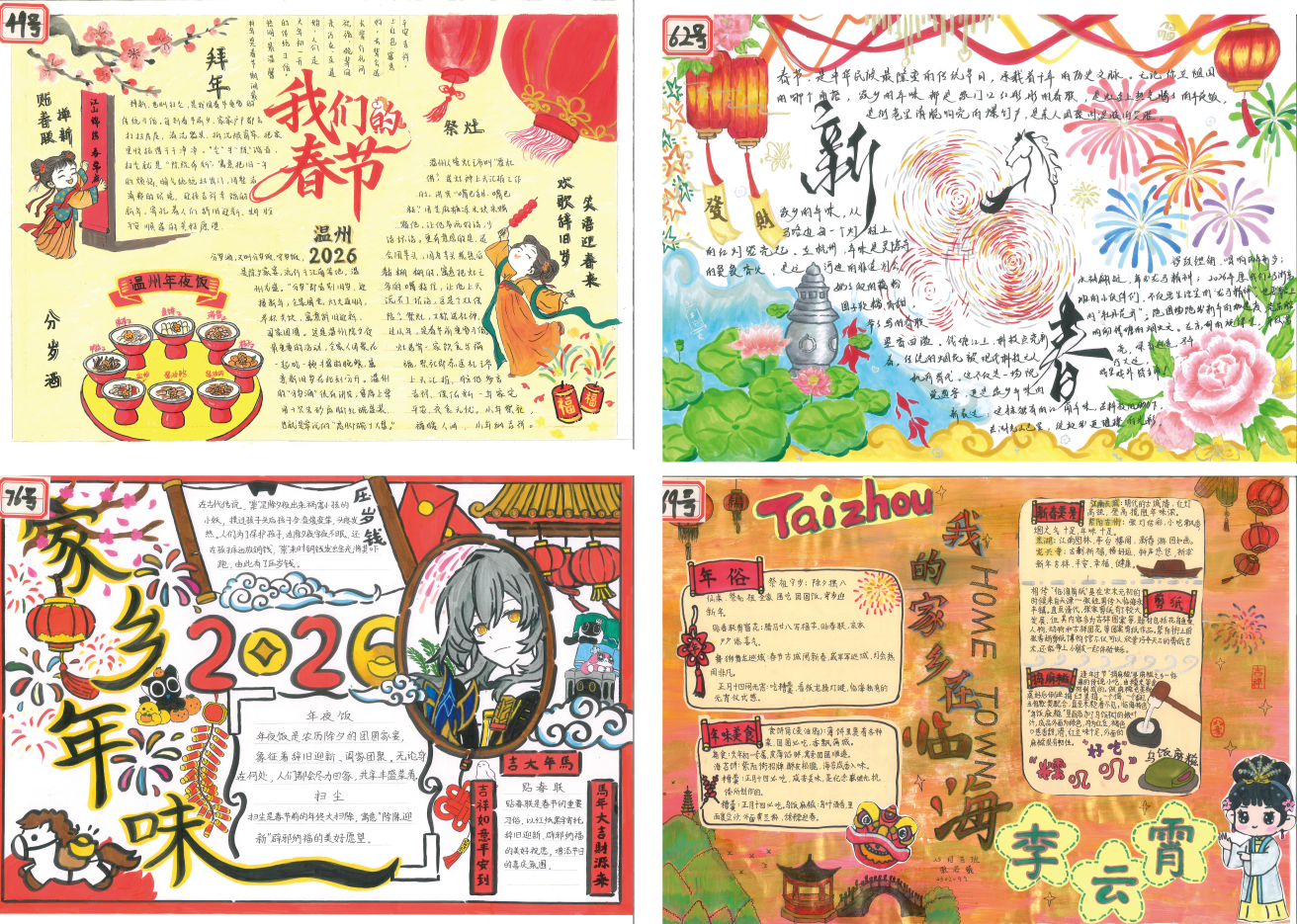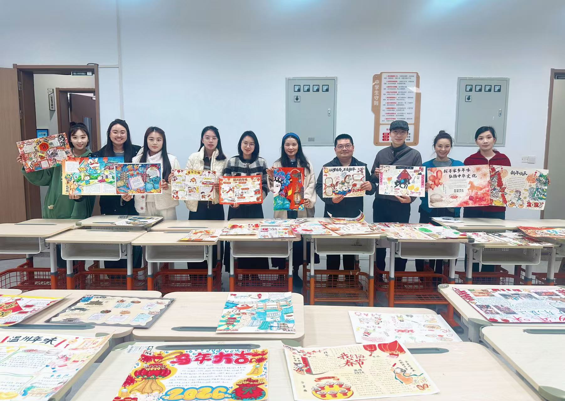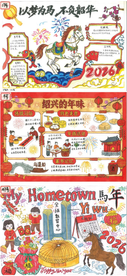 本次活动自2026年寒假启动,面向纯中专初中段学生开展。同学们以家乡年味为主题,走进街头巷尾、记录团圆时刻,将年俗风情、家乡美食、故土美景等元素融入手抄报创作。所有参赛作品均为原创,以A3及以上画幅,用细腻线条与斑斓色彩,表达了对年味的纯粹理解和对家乡的深情,成为中华文化在少年心中扎根的生动见证。