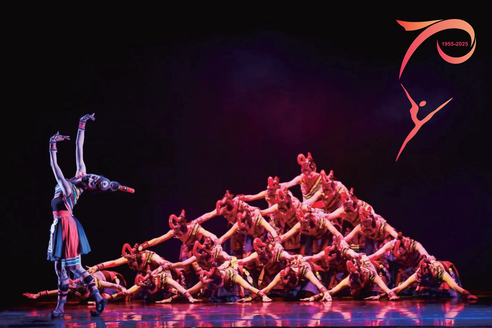 标识创意以浙江艺术职业学院校标为本体,将原本飘逸的水袖彩带通过巧妙的几何变化,幻化为70周年数字造型,与下方倒踢紫金冠舞者相结合,意喻“七秩芳华、精艺致远”校庆主题。