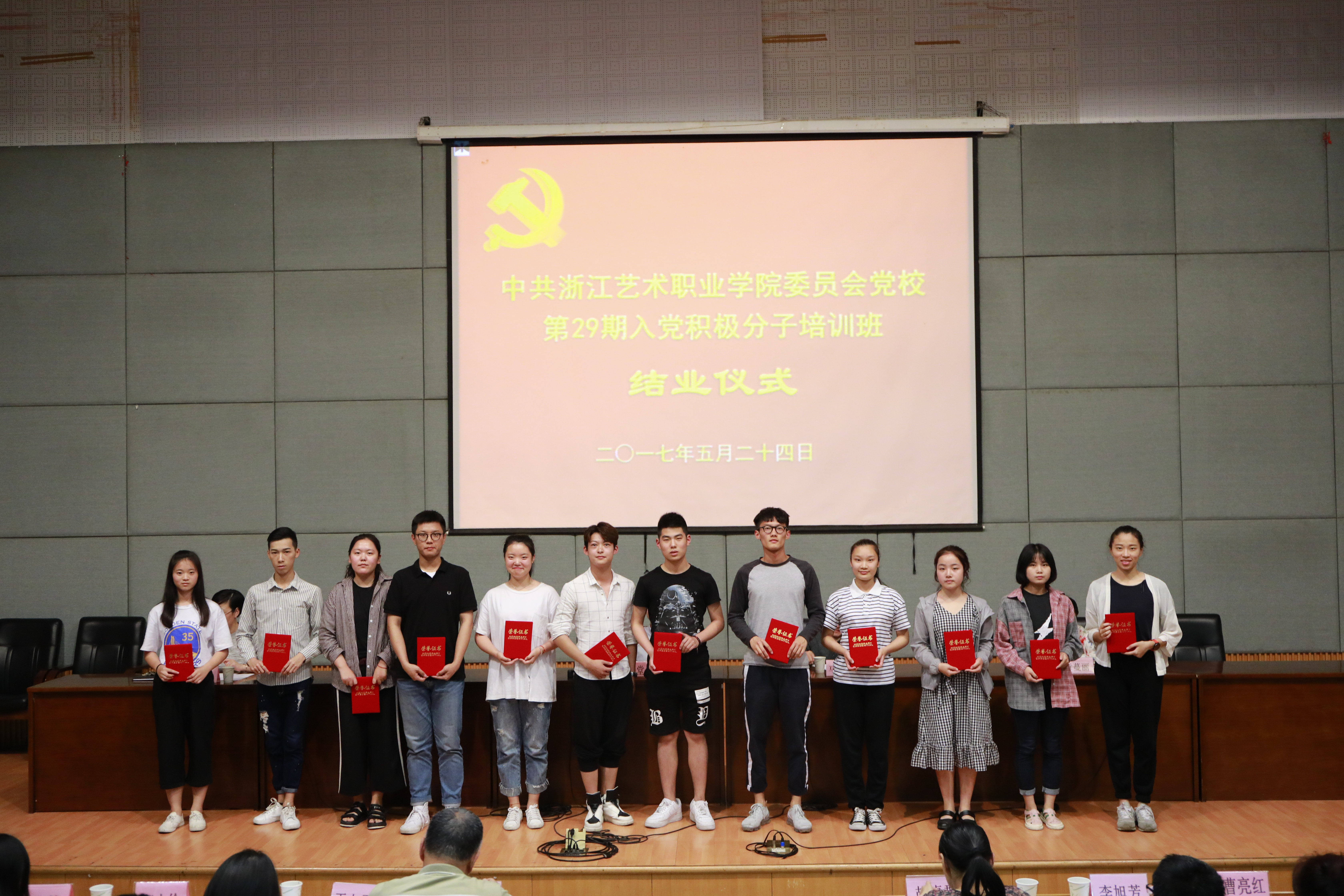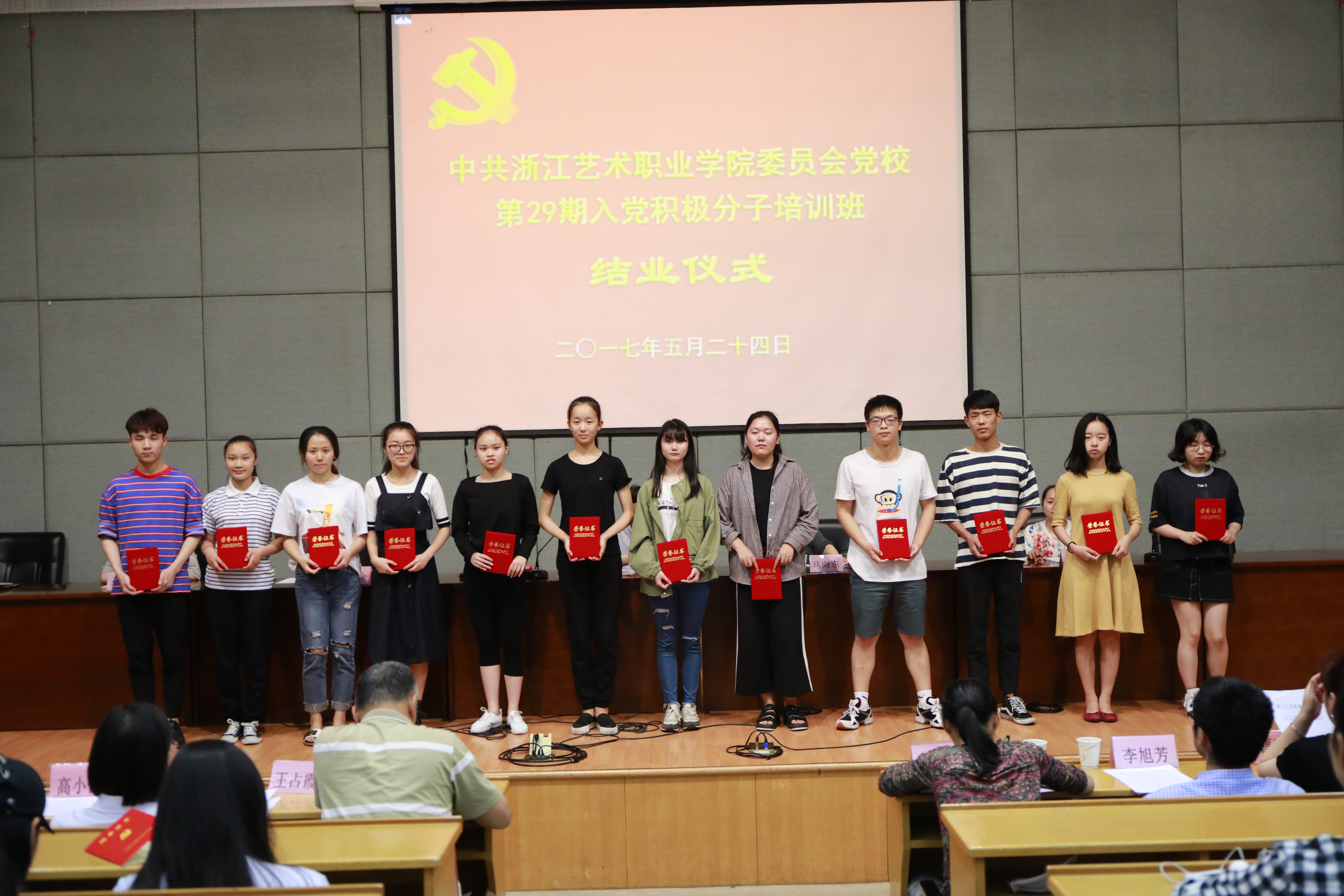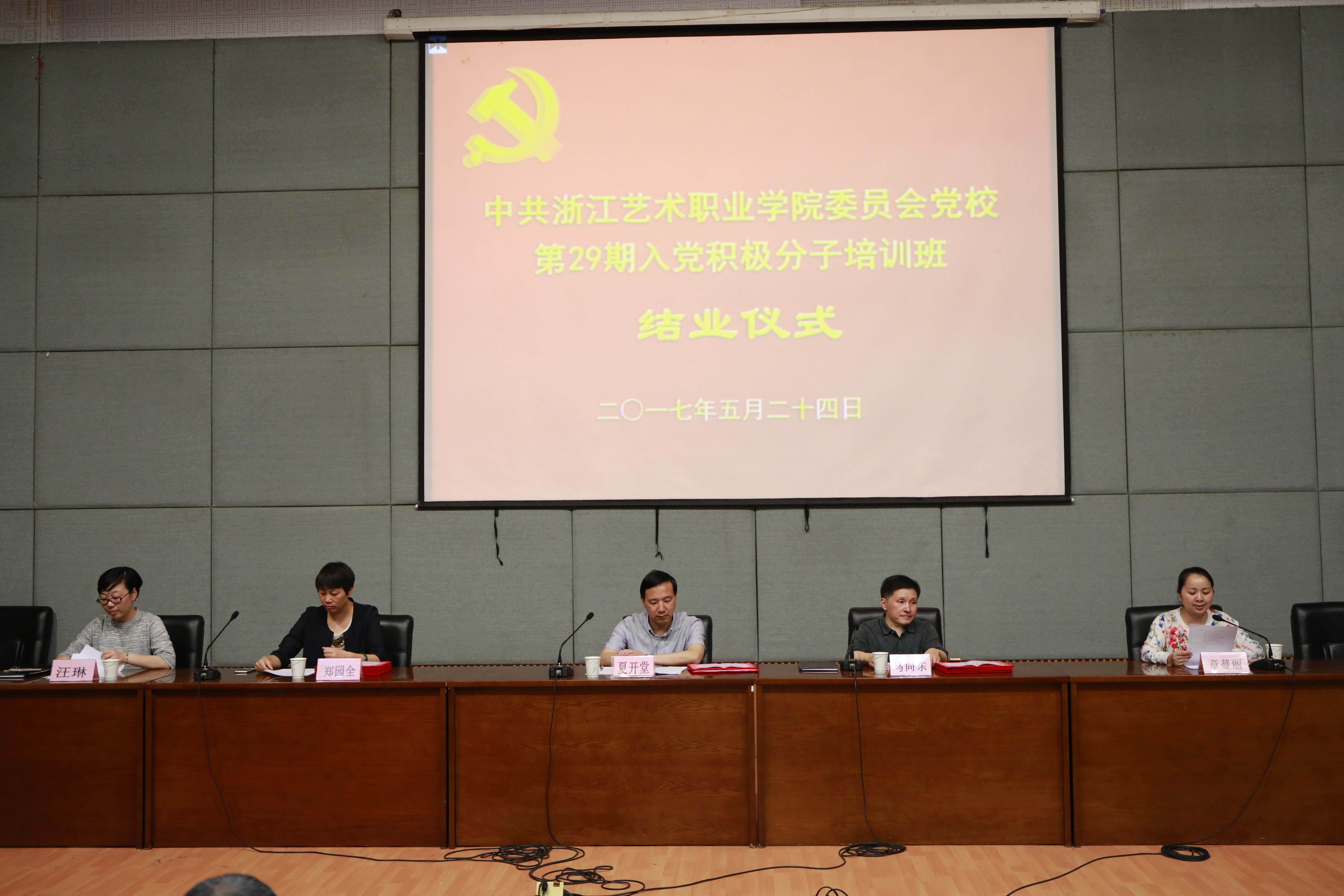 524日晚,浙江艺术职业学院党校第29期培训班结业仪式在图信中心报告厅举行。党委委员、副院长夏开堂,党校校务委员、党委宣传教育处处长马向东,基础教学部副主任(主持工作)郑园全、党校校务委员、音乐系党总支副书记章蔓丽,组织处副处长汪琳,各系党总支副书记、党校教研室教师、班主任和本期培训班学员等出席仪式。马向东主持结业仪式。
