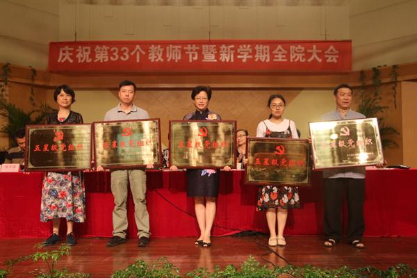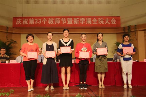 党委委员、副院长夏开堂宣读2016年度院级先进集体和个人(含优秀干部、优秀教师、优秀教育工作者)、院级先进党组织和优秀共产党员、厅级以上优秀团队和人才称号、挂职锻炼人员年度考核优秀人员表彰名单,党委委员、副院长沈恒宣读2016-2017年度学院在各类重大赛事中的获奖表彰名单。院领导为获奖集体和个人颁发奖证奖牌。