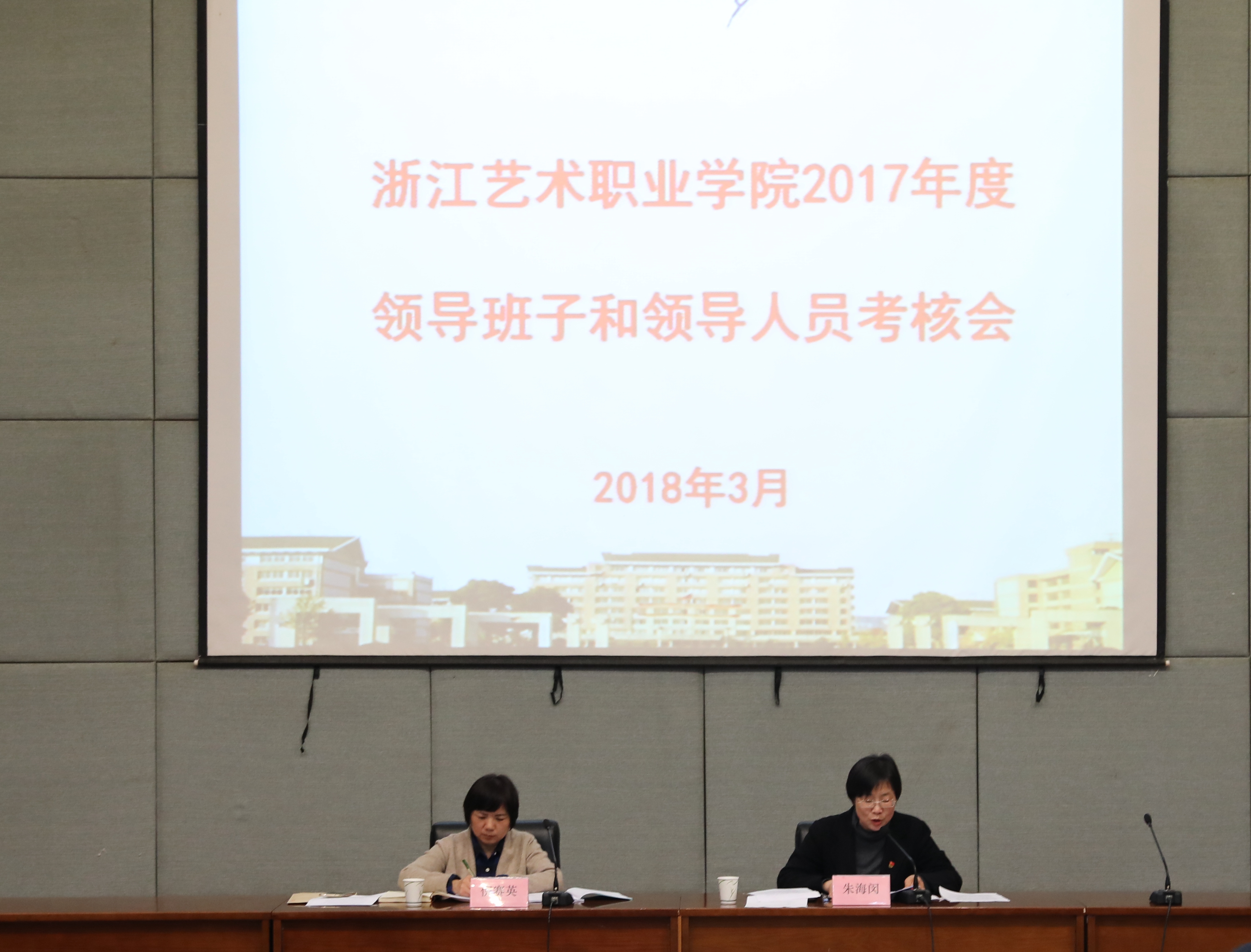 朱海闵代表学校领导班子作2017年度工作总结并作个人述责述德述廉述法报告,其他领导班子成员个人述责述德述廉述法情况以书面形式进行了报告。倪赛英对2017年度学校领导班子和领导人员考核测评工作作了布置和说明。