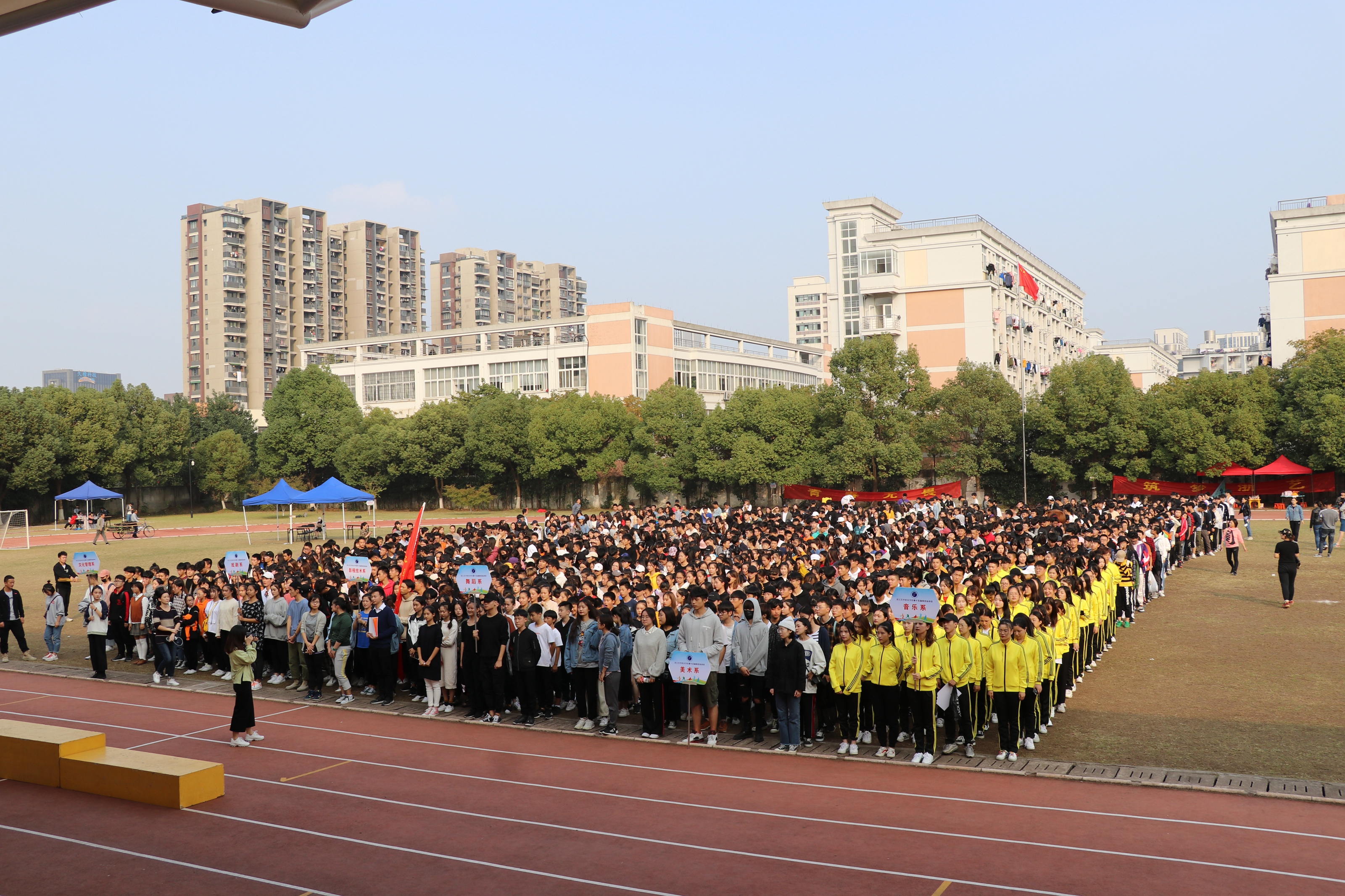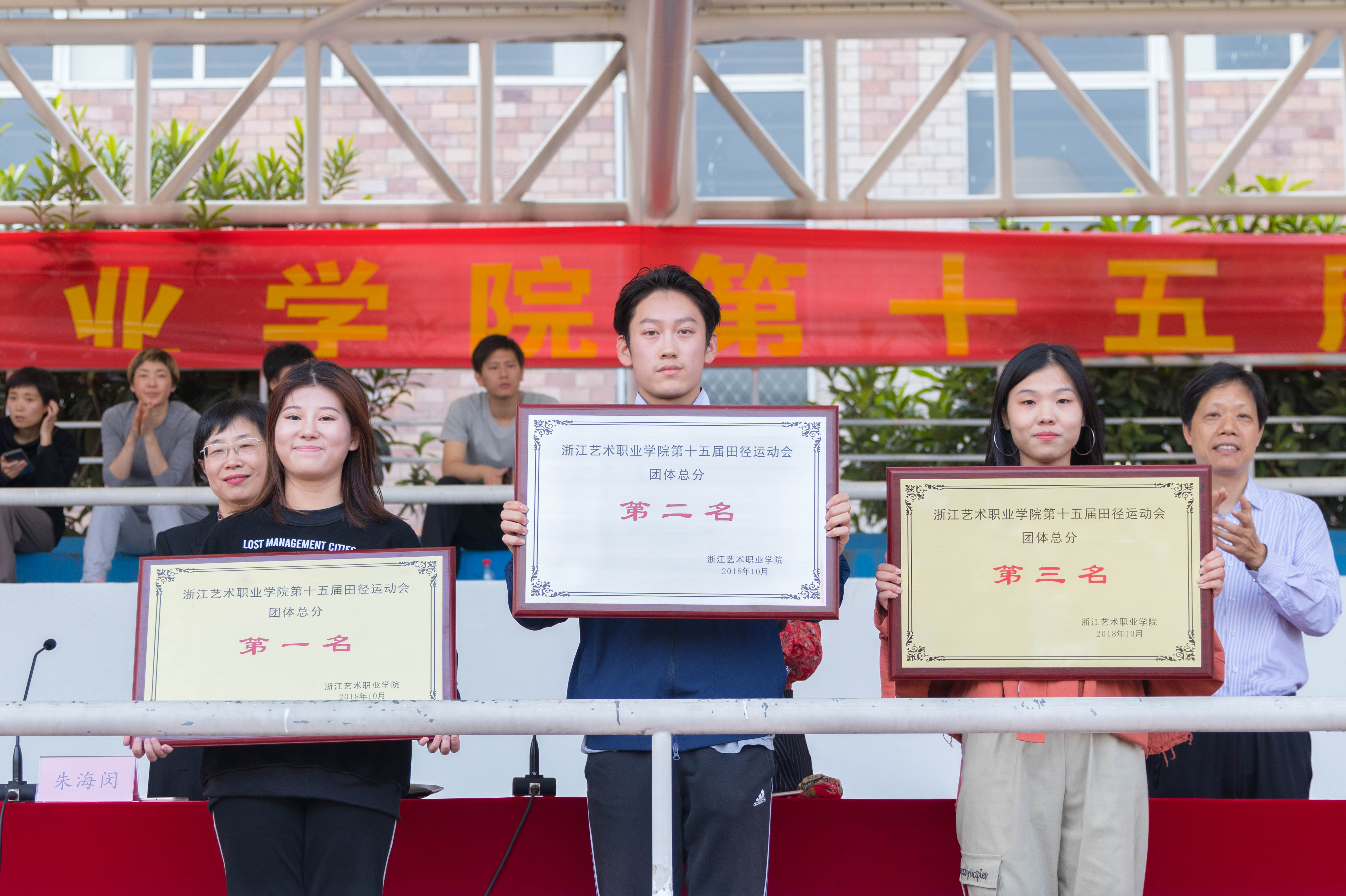 惠风和畅,秋阳高照,10月26日下午,浙江艺术职业学院第十五届田径运动会在两天激烈的赛事竞逐后迎来闭幕式。校领导朱海闵、黄杭娟、夏开堂、徐芳、沈军甫、王涛、马向东及各系运动健儿们参加闭幕式。校党委副书记夏开堂主持闭幕式。本届运动会有695名体育健儿进行了30个项目的比赛,共决出3个团体项目奖,27个单项奖,2个“体育道德风尚奖”,1个“团体操特别表演奖”,1个“开幕式突出贡献奖”和2个“集体协作奖”。