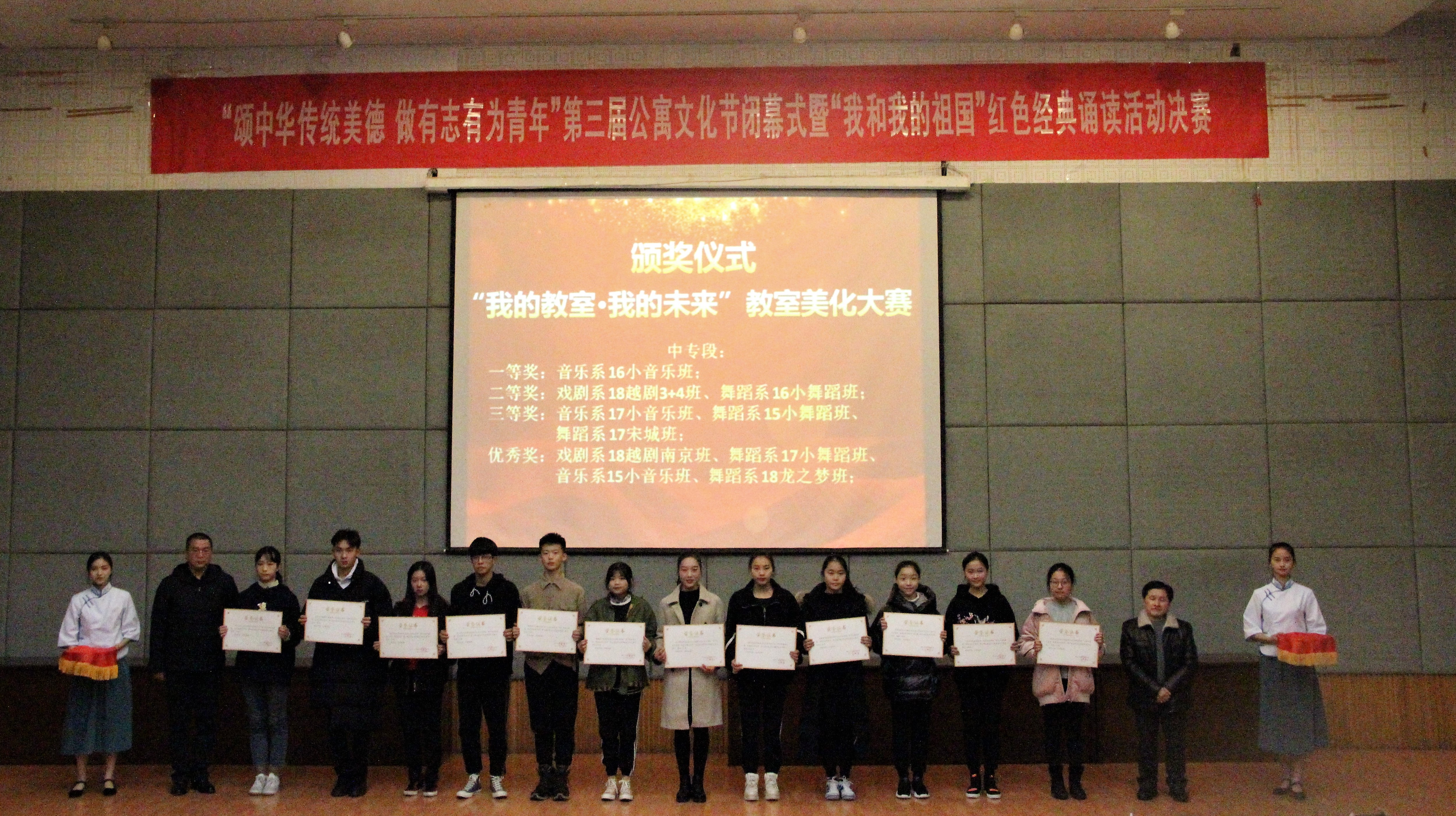 第三届公寓文化节闭幕仪式上,夏开堂宣读了表彰文件,参加活动的领导和老师共同为在文化节各项工作中涌现出来的先进集体和个人颁奖。