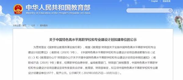 本次“中国特色高水平高职学校和专业建设计划建设单位”(以下简称“双高”)评选,经高职学校自愿申报,省级教育部门、财政部门审核推荐,中国特色高水平高职学校和专业建设计划项目建设咨询专家委员会评审,教育部、财政部审定,拟立项中国特色高水平高职学校和专业建设计划建设单位197个,现正公示。公示期7天。