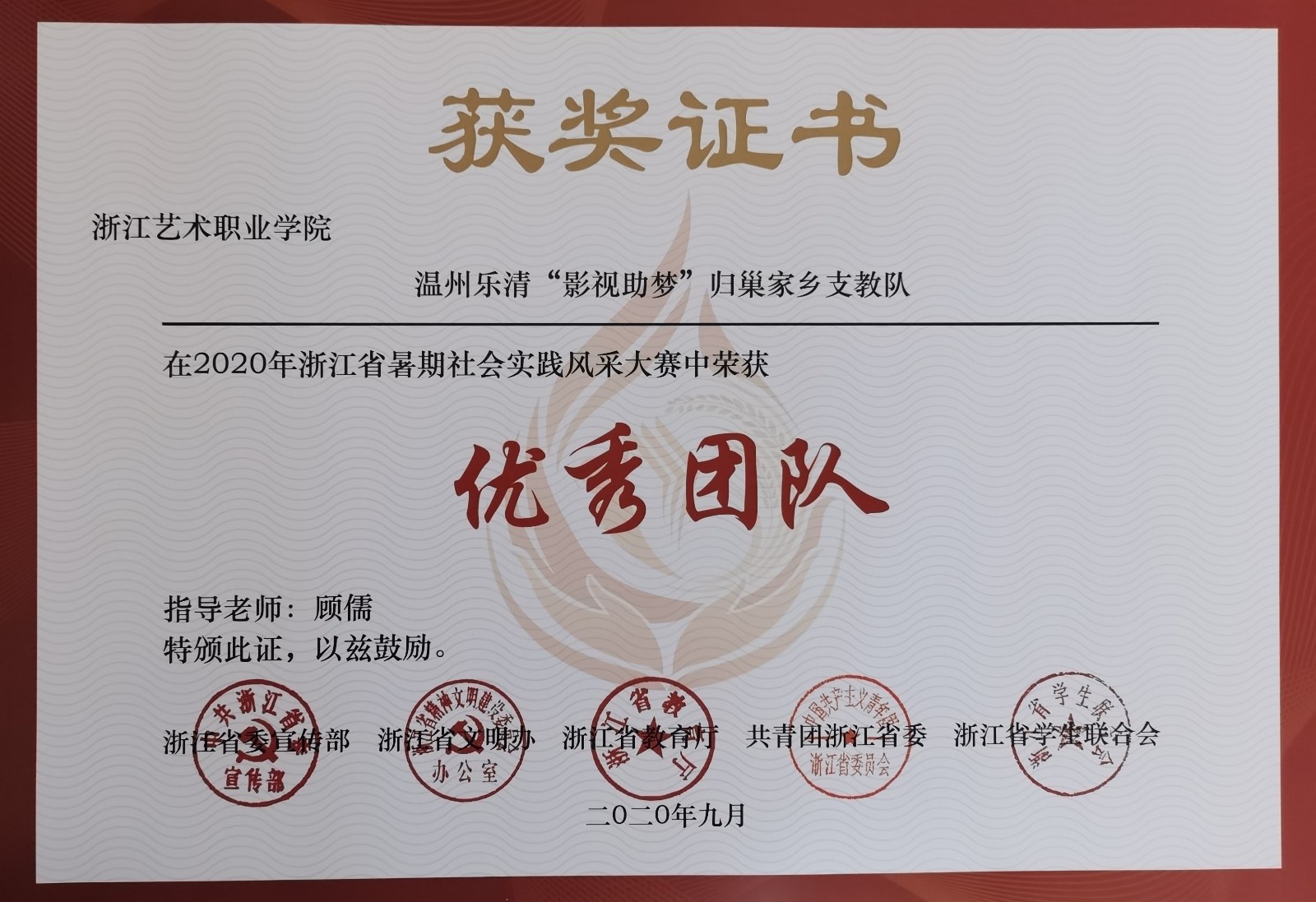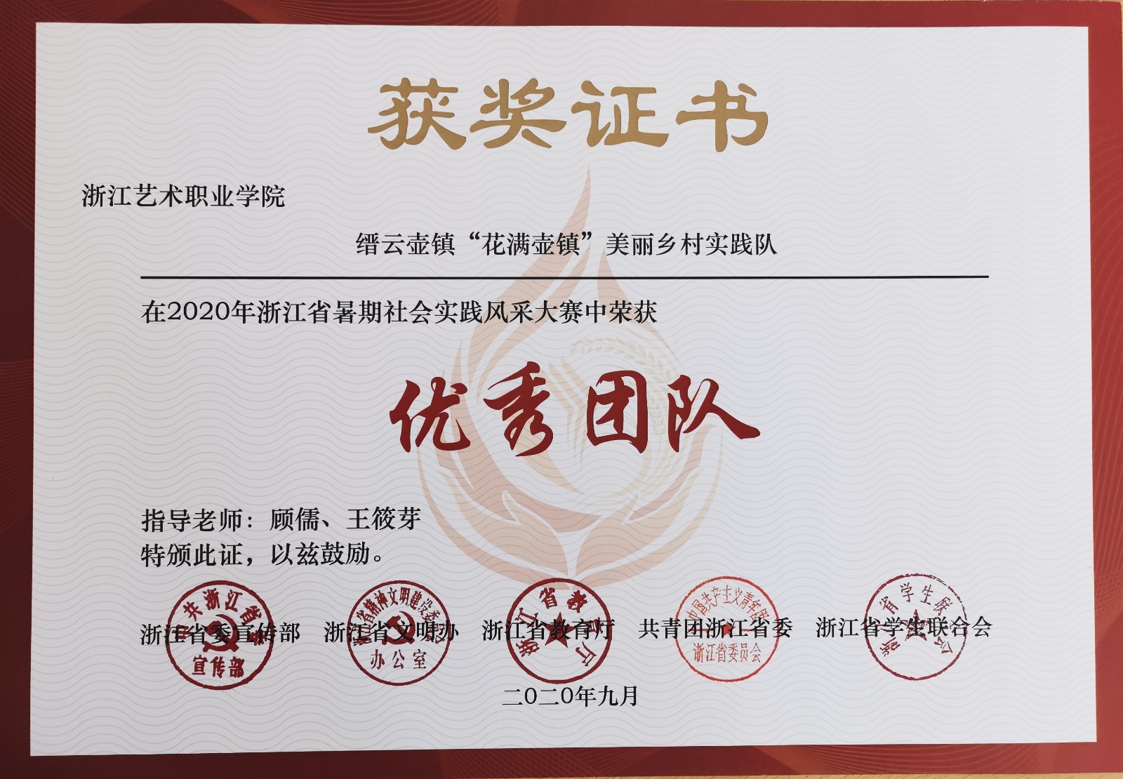 另悉,在省委宣传部、省文明办、省教育厅、团省委联合主办的2020年浙江省暑期社会实践风采大赛中,我校“云梦浙里”“诗画浙江”两支团队获得全省“百强团队”。
