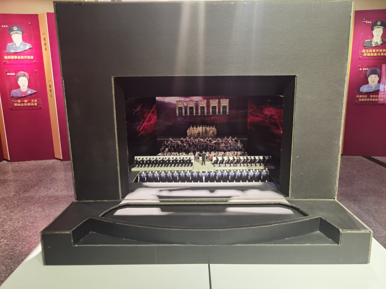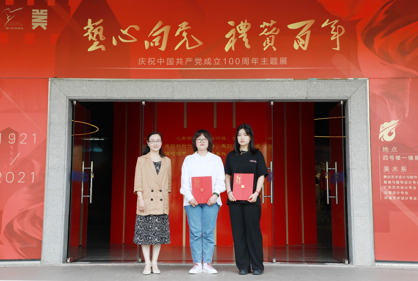 本次展览由美术系承办,是学校庆祝中国共产党百年华诞主要活动之一。整个展览分为“开天辟地”“改天换地”“翻天覆地”“惊天动地”四大篇章,涵盖了美术系舞台艺术设计与制作专业、服装与服饰设计专业、广告艺术设计专业、动漫设计专业及环境艺术设计专业等五个展示板块的美术作品。舞台艺术设计与制作专业展示板块以绘景的形式生动地展现了“中共一大会址”、“嘉兴南湖红船”和“革命圣地延安宝塔山”三个重要的历史地点与场景;服装与服饰设计专业展示板块结合专业教学开展《清溪谣》《黎明前的诀别》等剧目的服装服饰设计,以舞台服装实物进行呈现;广告艺术设计专业展示板块主要展出反映新时代新风貌的主题海报;动漫设计专业展示板块运用插画栩栩如生地再现了改革开放时期20位改革先锋人物;环境艺术设计专业展示板块通过资料查找和模型搭建等程序,等比例缩放手工制作了天安门及人民大会堂的实物模型。