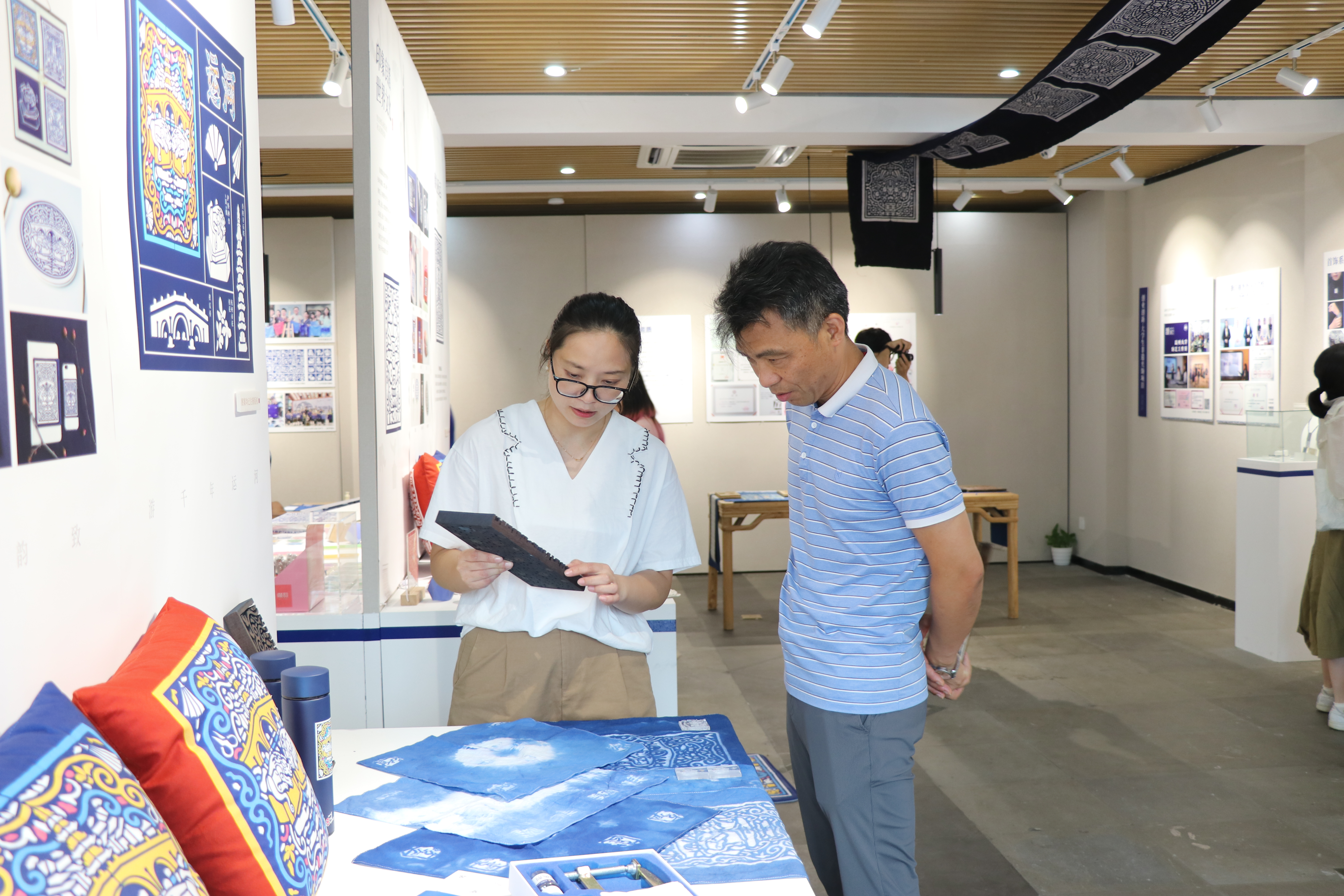 此次展览“传统夹缬展区”展示非遗夹缬发展历史,探寻传统蓝染韵味;“夹缬文化传承与创新区”展现夹缬传统新貌,融入现代元素焕发传承新活力;“夹缬文化之礼区”将夹缬、地域、民俗文化巧妙融合,衍生传承新模式;“夹缬互动研学区”借力实践互动感悟古缬新韵。