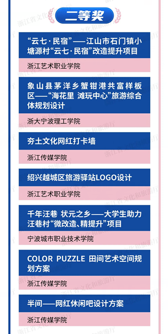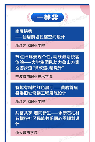 本次大赛是深入贯彻浙江省旅游业“微改造、精提升”五年行动计划的生动实践,让高校师生成为助力浙江旅游业高质量发展的新生力量,助力实现“席地而坐,悦心而游”。自今年6月大赛启动以来,共征集到22所高校共81组参赛作品。经过角逐,首届浙江省大学生助力旅游业“微改造、精提升”创意策划大赛最终产生一等奖4个,二等奖7个,最佳创意奖1个,最佳策划奖1个,同时公布了10个三等奖、10个优秀奖和5个最佳组织奖名单。