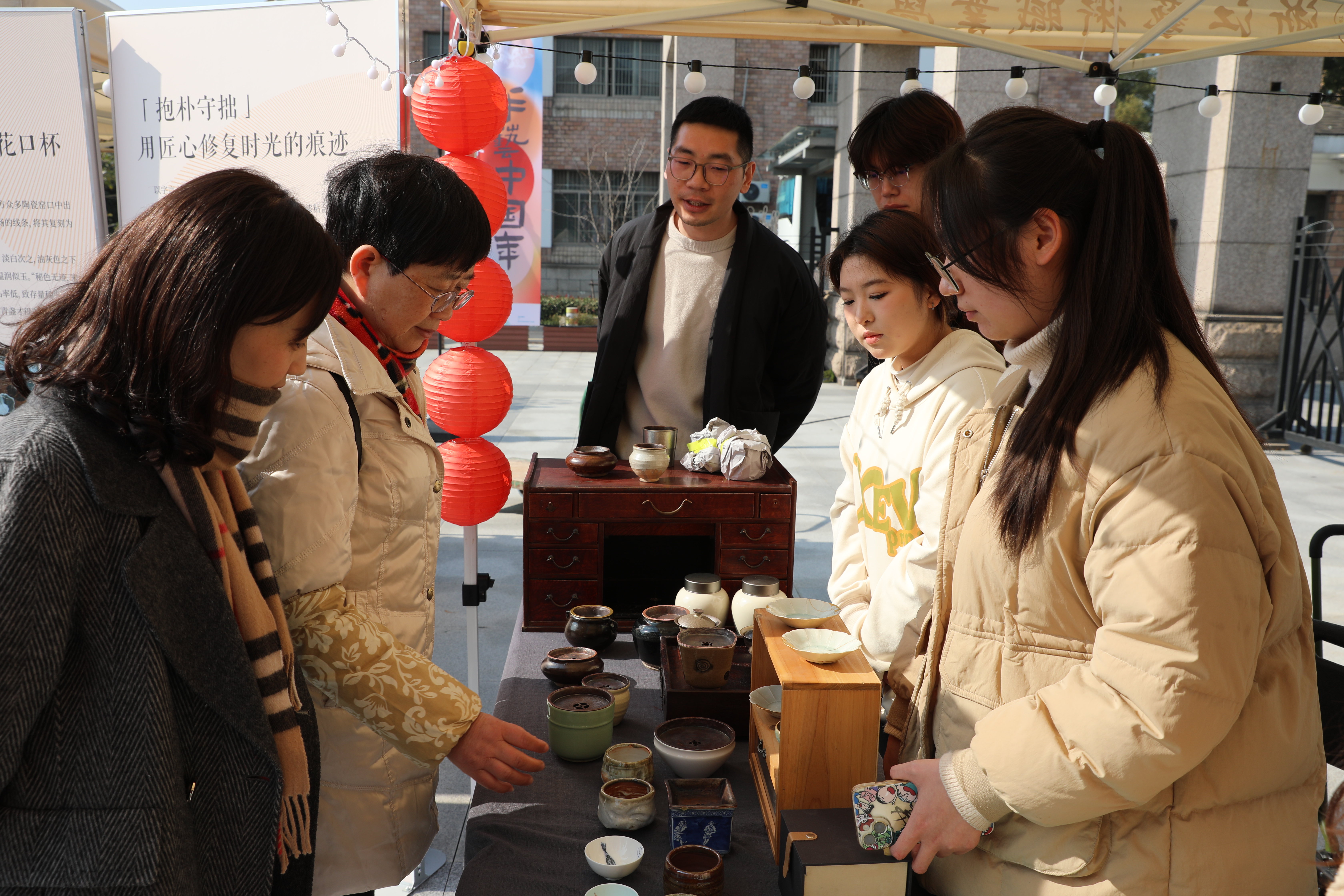 活动现场特邀自然造物、田博匠新、文博公司等非遗企业参与,摊位上非遗手工艺品琳琅满目,引得不少老师、同学驻足观赏。