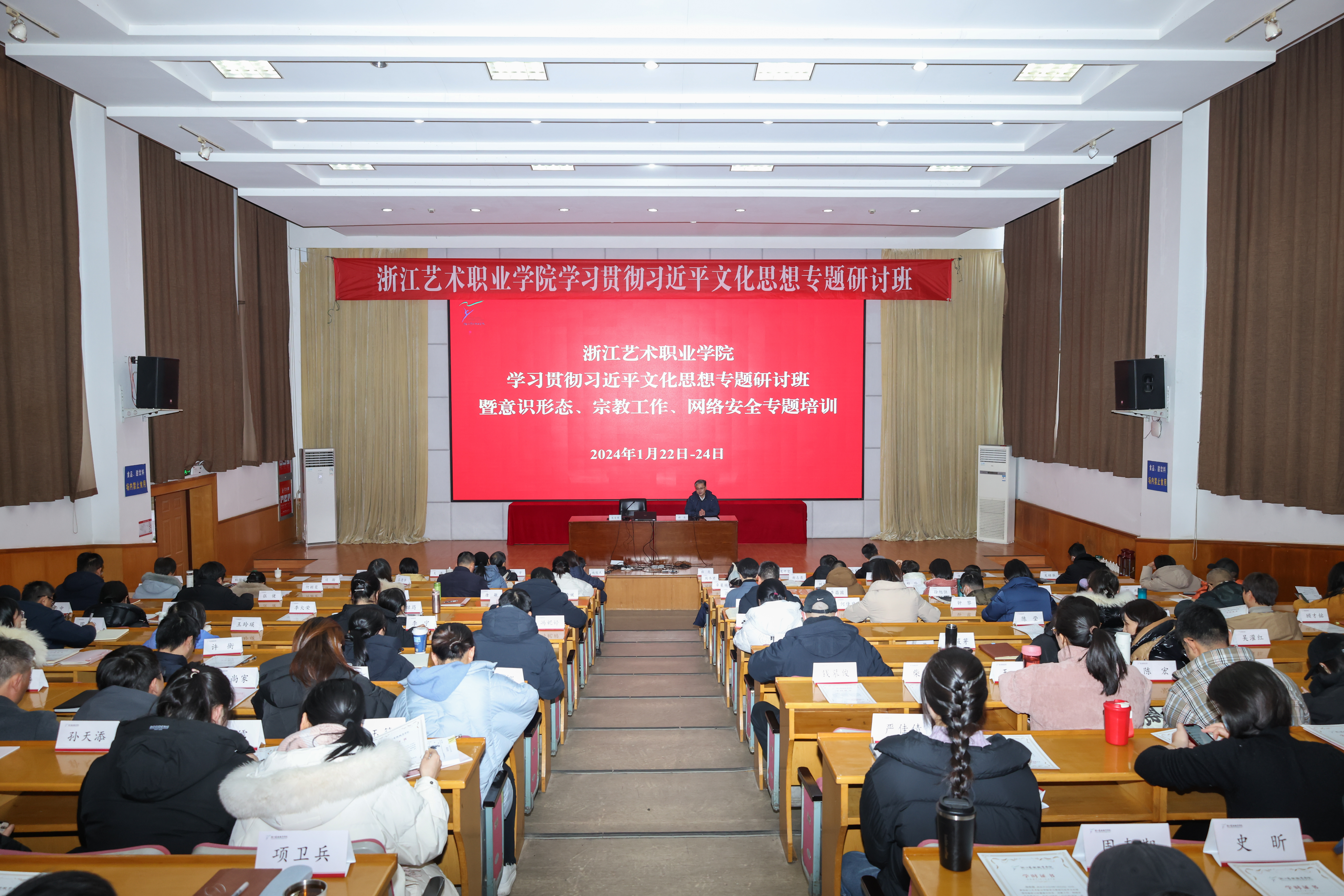1月22日至24日,浙江艺术职业学院学习贯彻习近平文化思想专题研讨班暨意识形态、宗教工作、网络安全专题培训在学校图信报告厅举行。校党委班子成员、中层领导人员、主管岗位管理人员、基层党支部书记、马克思主义学院专任教师、辅导员、班主任代表等近150人参加并结业。
