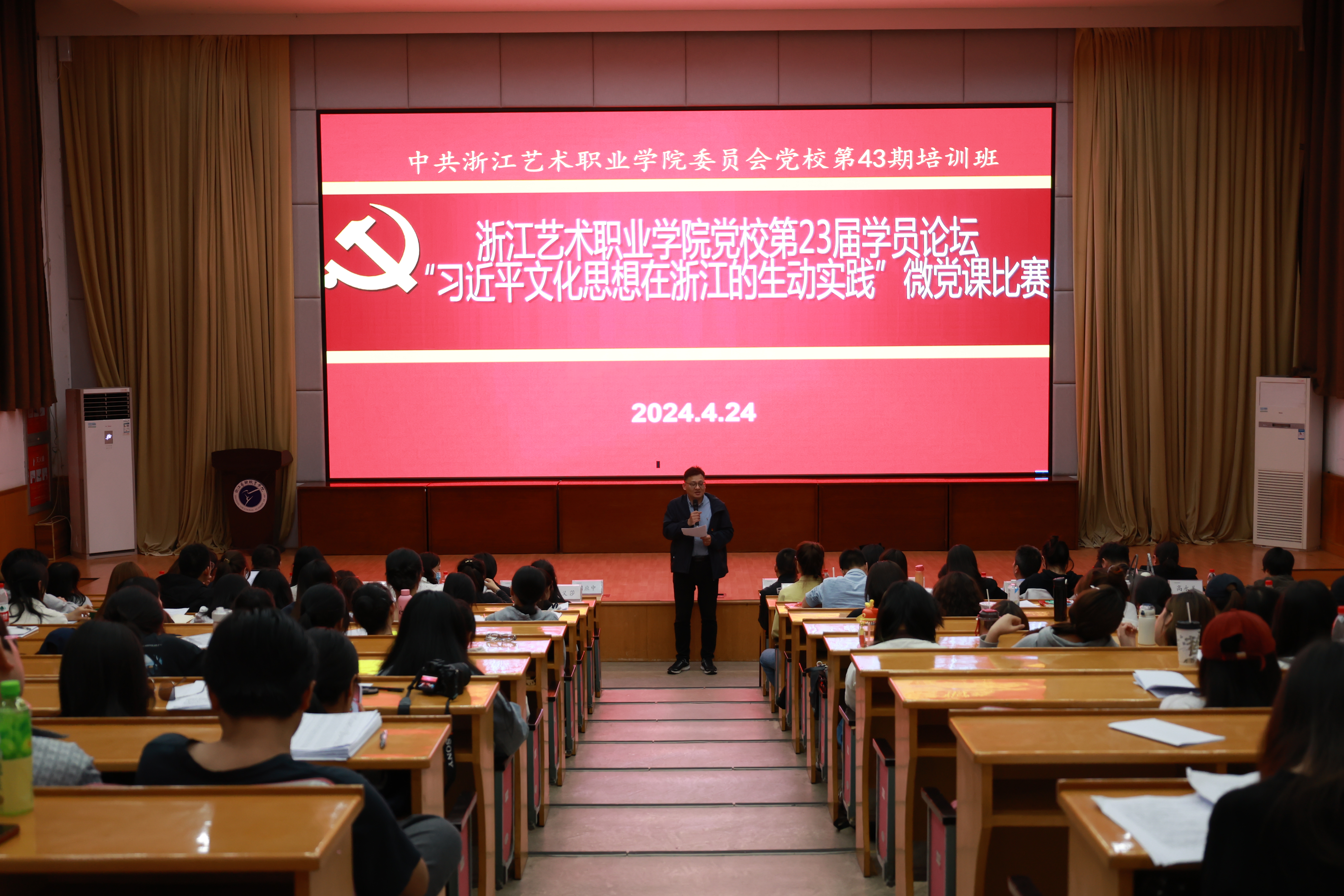 为深入学习贯彻习近平文化思想,学懂弄通做实习近平总书记对浙江工作以及文化广电和旅游系统特别是文旅融合深度发展的重要指示批示精神,4月24日晚,浙江艺术职业学院43期党校第23届学员论坛暨“习近平文化思想在浙江的生动实践”主题微党课比赛在图信中心报告厅举行。党委委员、组织部部长、人才办主任、党校副校长周应中出席,组织部、宣传部、各教学单位党总支(直属党支部)负责人、党校任课教师、党校班主任、第43期党校学员共170余人参加并观摩比赛。