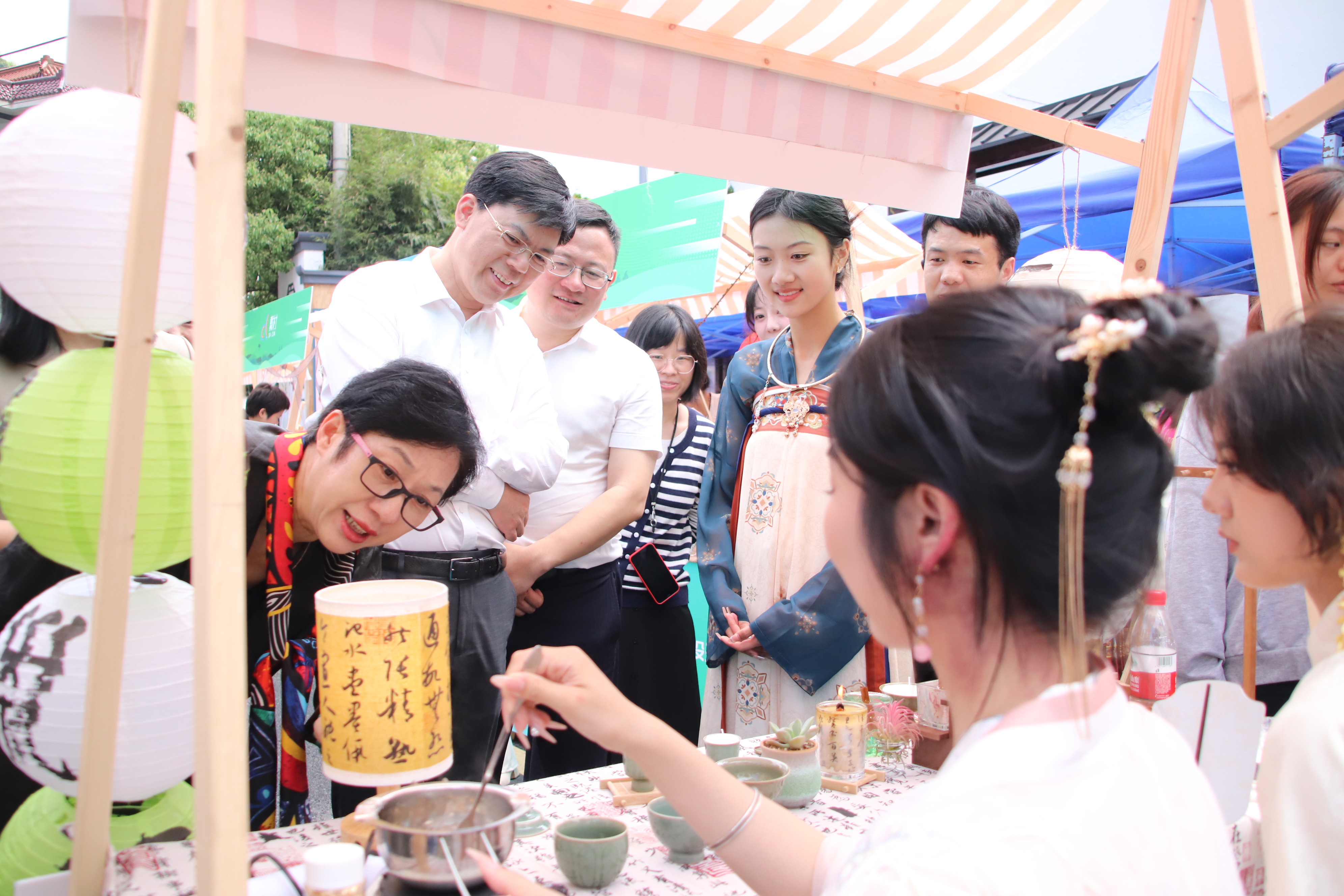 活动现场人头攒动,一个个摊位上的文创产品琳琅满目。中国传统书画跃身于灯笼、香薰蜡烛、书签、纸伞、纸扇、挂件之上,与创意产品完美结合,精致美观又充满文化气息,引得现场观众频频驻足,争相购买。大家在一件件扇面和书签中体悟融入生活中的艺术,从火漆印章和香薰蜡烛中感受传统文化的新魅力。值得一提的是,师生们还为戴村镇大石盖村开发了系列文创产品,也受到一致好评。