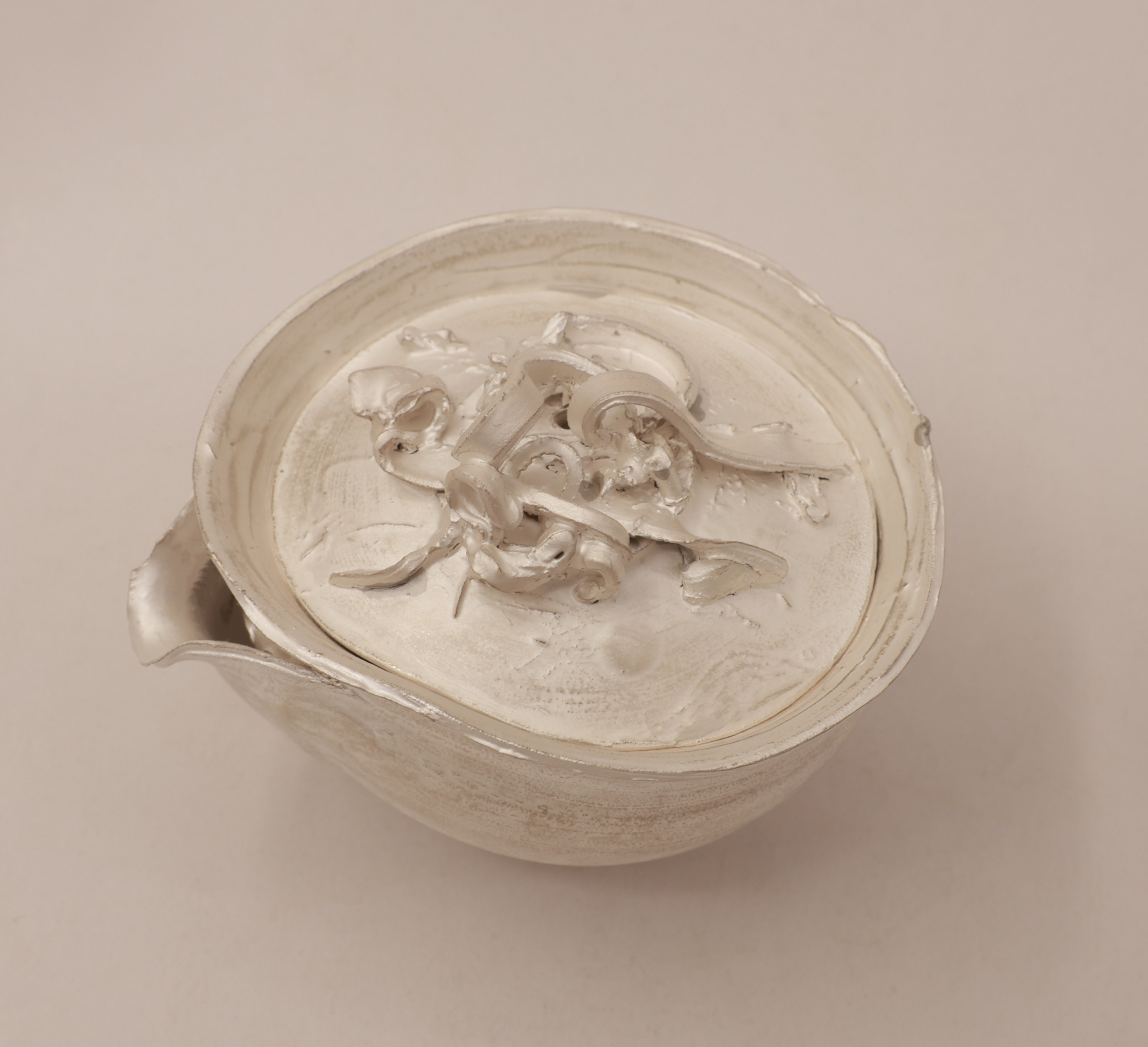 创作理念:黏土真的很神奇,因有水的加持,柔软似丝绸划过指尖,因有火的加持,又回归岩石般质地。创作者只有谦卑地顺应泥性,才能通过土的语言来表达。本次宝瓶的创作手法纯粹,只拉坯不修坯,尽可能保留创作痕迹而一气呵成。捉手是拉坯过程中的边角料率意堆砌,瓶身椭圆壶口向内边稍倾,看似随意的手法又尽量满足实用需求,盈盈一握,出汤利索,烤银后的金属质感又增添了一份现代气息,与写意的创作手法相得益彰,是创作者内心的一次浪漫之旅。