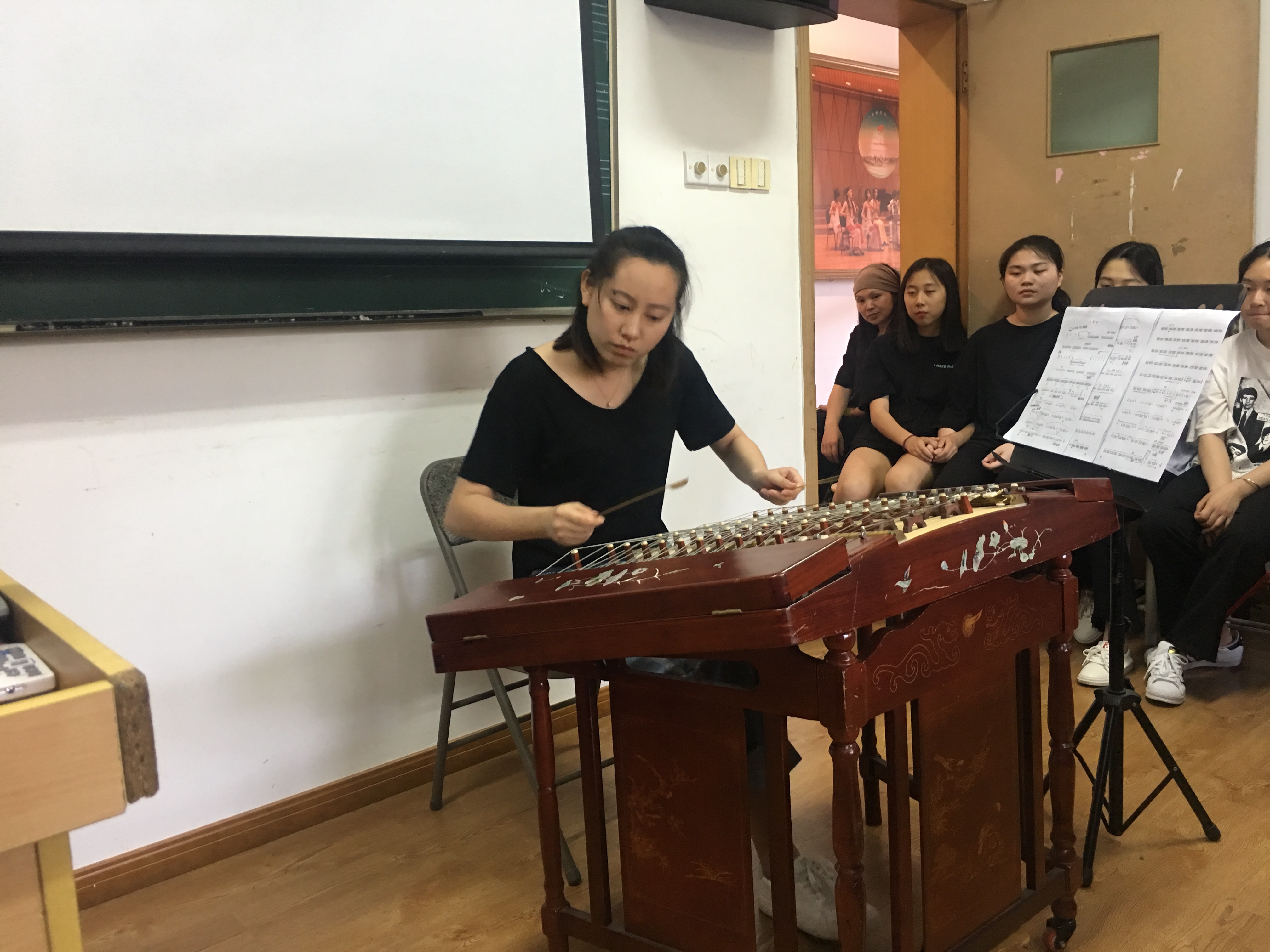 音乐系民乐教研室师生认真聆听了作曲家的作品分析及由袁文君示范的《忆事曲》精品版本,得到了周煜国先生的悉心指导与技术上的研究,对扬琴师生来说是一次难得的学习机会!我们走近大师与大师近距离的探讨音乐作品受益匪浅,民乐教研室感谢院系领导的大力支持!感谢周煜国先生的精彩讲座!期待更多的学习机会!