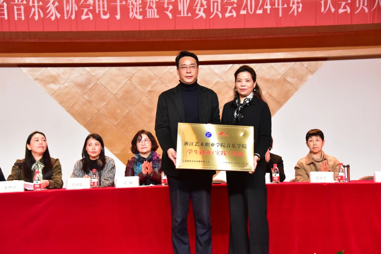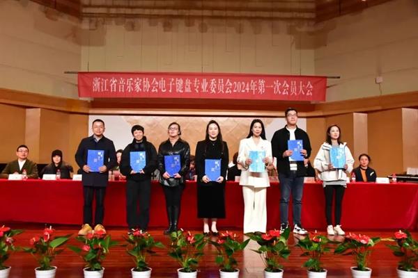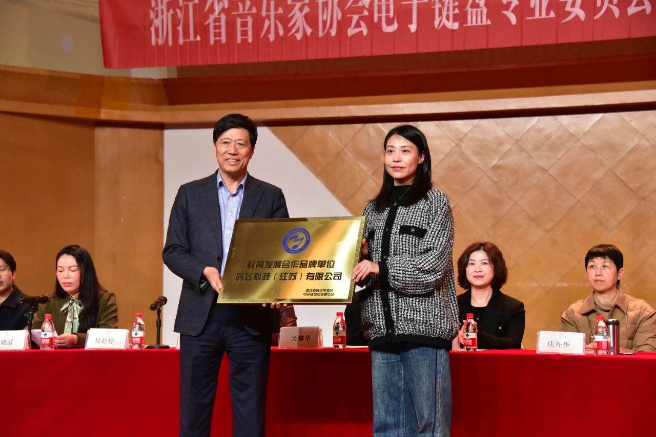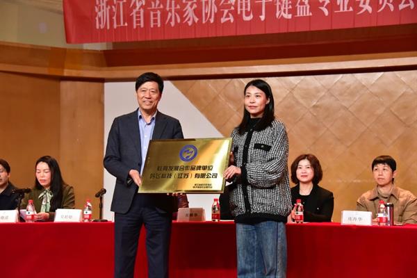 吴婷婷主任为吟飞科技(江苏)有限公司颁授浙江省音乐家协会电子键盘专业委员会教育发展合作品牌单位匾牌;杭州起点乐器有限公司颁授总部驻地匾牌。同时,主席团为本届常务理事和理事颁发聘书
