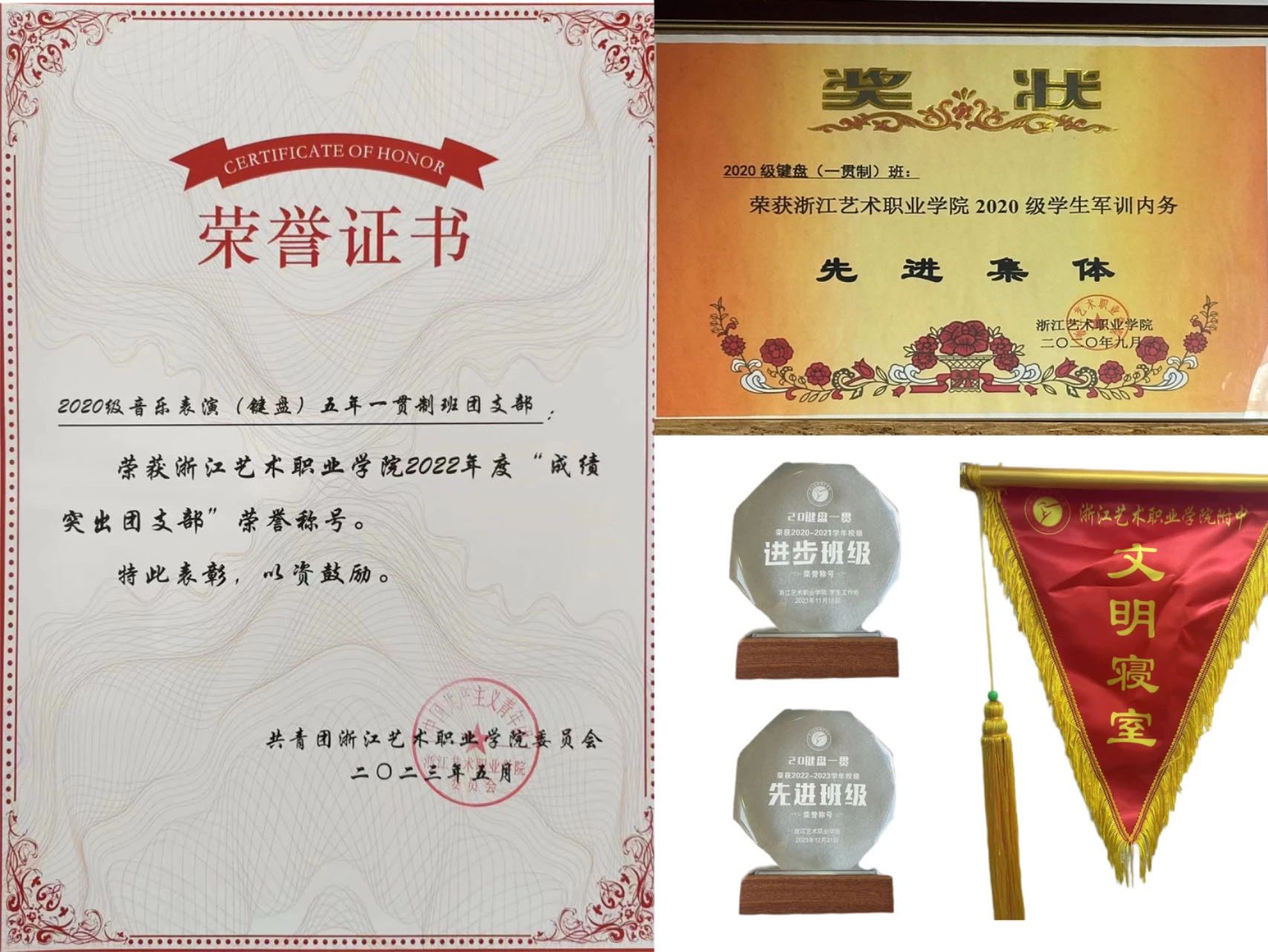 携手共进是班级永恒的主题。班上经常组织有趣的团建活动,如元旦包饺子,端午趣味游戏,增强大家对集体的归属感。团结友爱的同时也通过班规督促学生逐渐养成规矩意识。初入校园班主任制定了“四该”班规:该吃饭时好好吃饭、该睡觉时按时睡觉、该学习时认真学习,完成各科作业、该玩耍时尽情玩耍。这一简单务实的班规,让班级学生快速进入角色和身份。随后班级建设的成效也逐步显现出来。20键盘一贯班在军训内务评比中荣获“先进集体”的荣誉称号,先后获“先进班级”、“进步班级”“文明寝室”等集体荣誉。2023年5月被评为“成绩突出团支部”,集体累计获奖共5项。