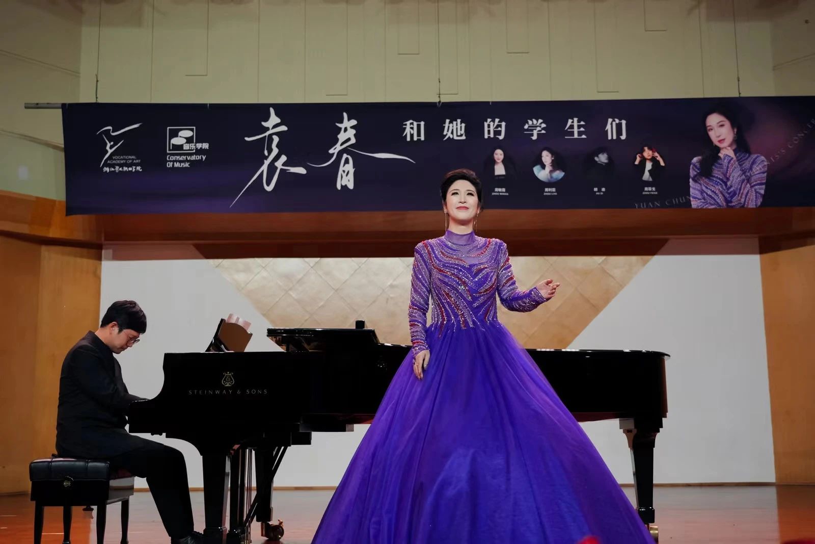 绽放的五月,充满着师生情,5月31日晚,在浙江艺术职业学院音乐厅里,“袁春和她的学生们”一起用歌声表达了对母校的爱。简洁而不简单的舞台,一架钢琴、一幅主题海报显得尤为端庄高雅,来自校内外的师生、嘉宾在开始前半小时,已经将整个音乐厅坐得满满当当。七点演出正式开始,音乐学院副院长章蔓丽一段开场白拉满年青气息,活动背景与领导嘉宾介绍间随意切换,瞬间让大家感受到校园音乐会的与众不同。简短开场白的最后,雷鸣般的掌声迎出了我们当晚的主角——抒情女高音、声乐硕士袁春老师。
