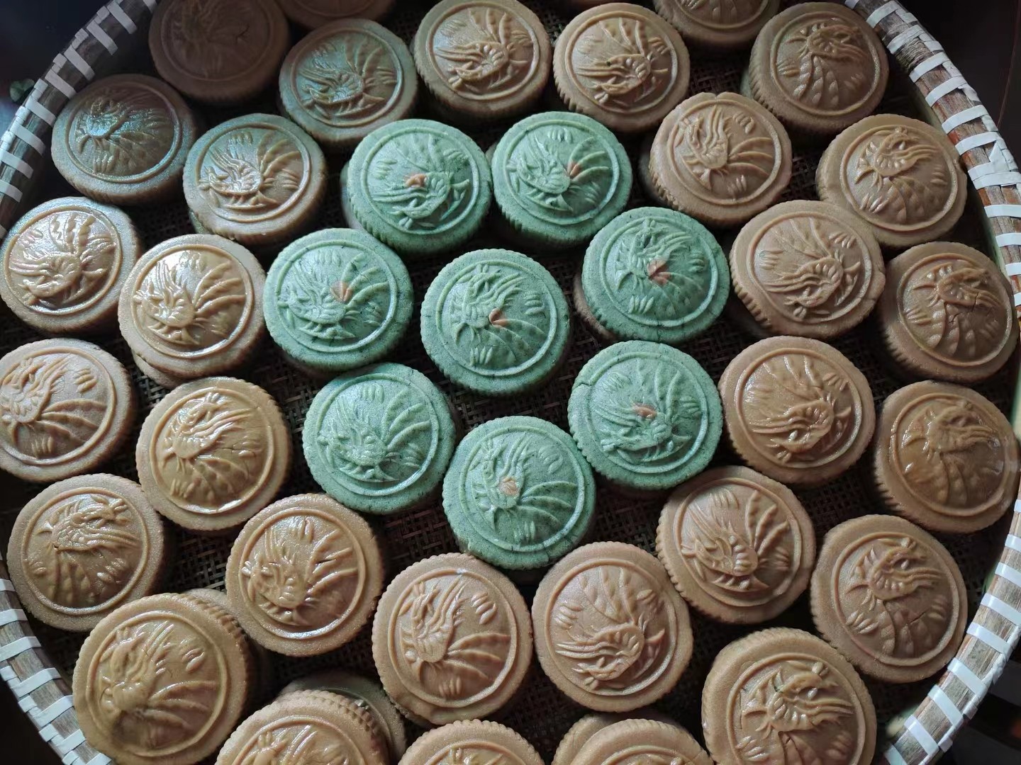 把做好的印粿整齐叠放在筛子里,满眼看去是咖啡色和绿色的印粿,内心特别欢喜,给过年增加了许多仪式感。听外婆说,做印粿就像做银元,银元上面印着袁大头,除夕在家做印粿就好比印制大洋,寓意来年财源广进。