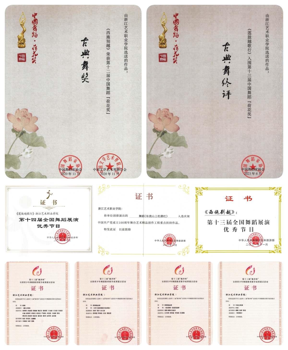 在提质培优上,先后创作群舞《莲鼓越歌行》《脚划船歌》、舞剧《灯火阑珊处》等20余部。4部作品入选国家艺术基金资助项目和文旅部建党百年舞台艺术精品创作工程。继《西施别越》荣获第十二届中国舞蹈“荷花奖”后,《莲鼓越歌行》再次入围第十三届中国舞蹈“荷花奖”。参加“桃李杯”、全国舞蹈展演、全国大学生艺术节、全国职业技能大赛等,实现获奖大满贯。创新团队研发《浙江景宁畲族舞蹈风格课》,收获全国各类舞蹈展演精品课程奖项与好评。复建两千多年前江南舞蹈《前溪舞》,填补“前溪歌舞”中国发展史上的空白。